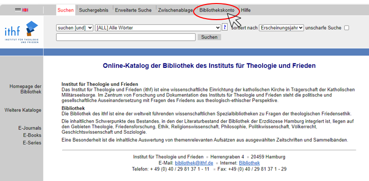 Sollte der Direktlink zum Benutzerkonto nicht funktionieren, folgen Sie bitte diesem Link ITHF Online-Katalog der Bibliothek, und klicken Sie dann, wie im Bild hierunter dargestellt auf „Bibliothekskonto“ und melden Sie sich mit ihren Benutzerdaten an.